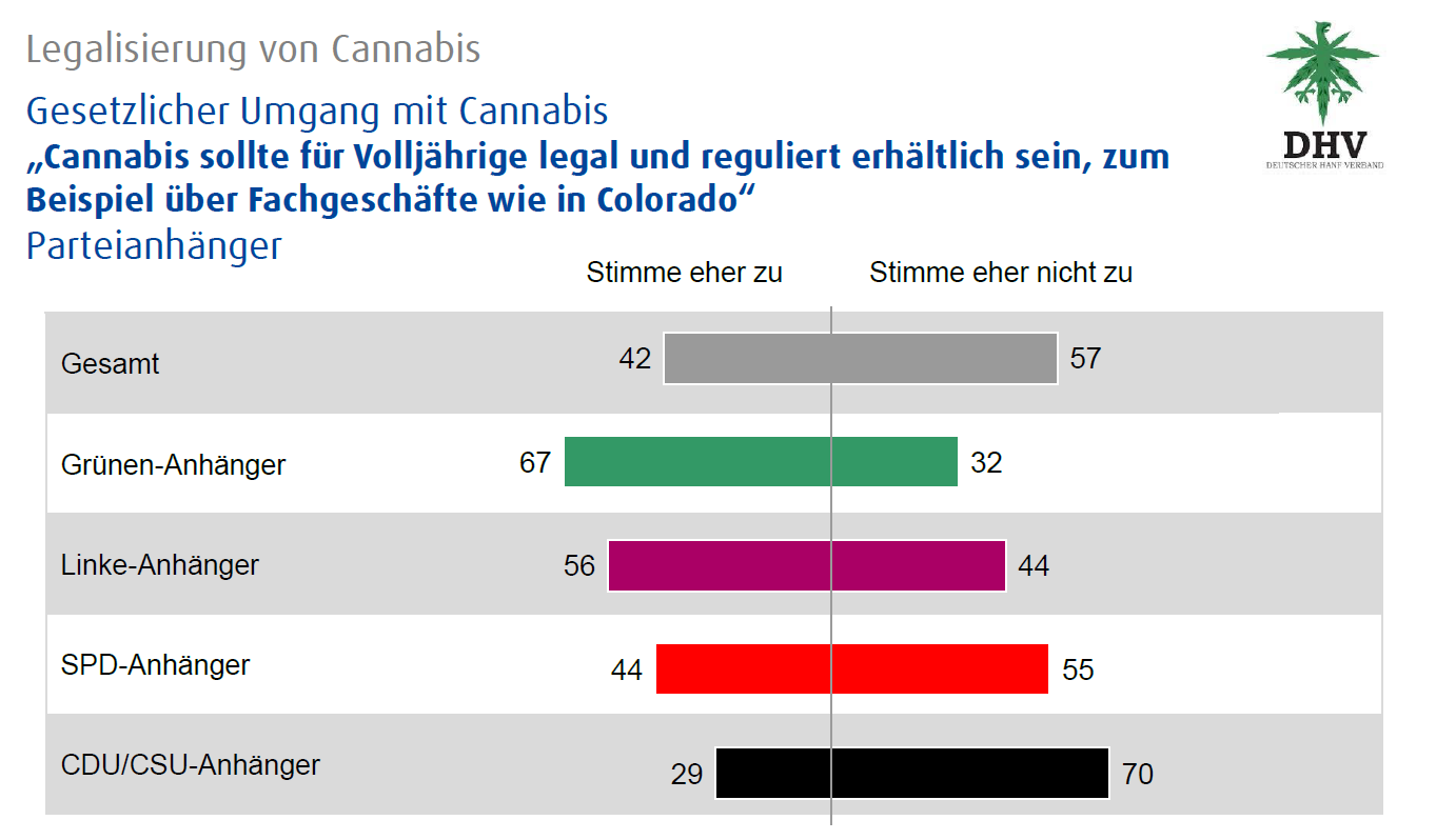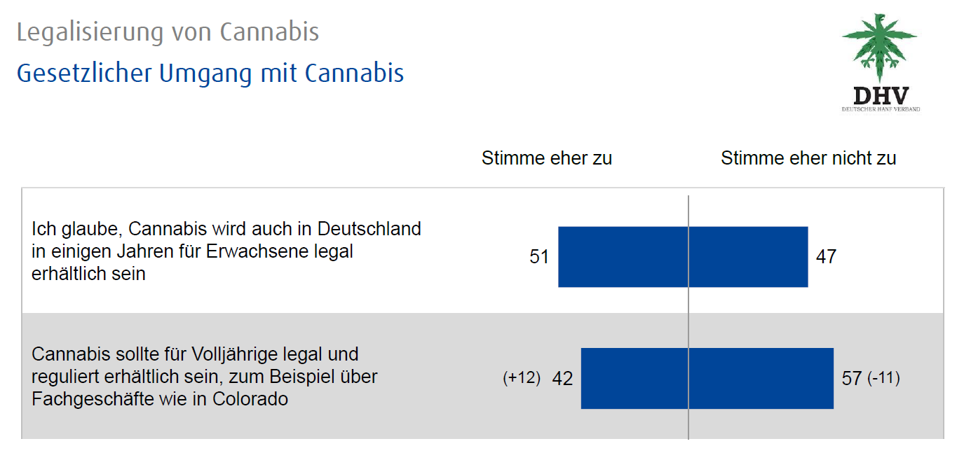 Der Anteil der Befürworter einer Legalisierung nahm innert Jahresfrist um 12 Prozent zu. 42 Prozent meinten „Cannabis sollte für Volljährige legal und reguliert erhältlich sein, zum Beispiel über Fachgeschäfte wie in Colorado“. Vor einem Jahr meinten dies nur 30 Prozent bei einer analogen Umfrage im Auftrag des DHV, die von infratest dimap im Zeitraum vom 27. bis 29. Oktober 2014 durchgeführt wurde.