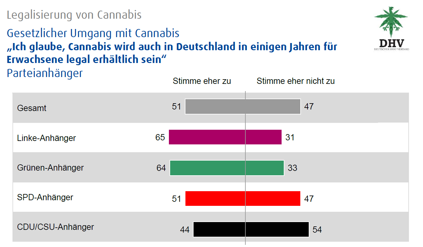 Die Mehrheit der Deutschen glaubt, dass Cannabis in einigen Jahren legal in Deutschland gekauft werden kann. Gemäß einer repräsentativen Umfrage von infratest dimap im Auftrag des Deutschen Hanfverbandes (DHV) stimmmte eine knappe Mehrheit der Aussage „Ich glaube, Cannabis wird auch in Deutschland in einigen Jahren für Erwachsene legal erhältlich sein“ zu. Doch die Erwartungen der Bundesbürger an die künftige Entwicklung der Rechtssituation gehen sichtbar auseinander: Eine knappe Mehrheit (51 Prozent) glaubt, Cannabis wird in Deutschland in einigen Jahren legal für Erwachsene erhältlich sein, während sich eine beachtliche Minderheit (47 Prozent) dies nicht vorstellen kann. Zwei Prozent der Befragten hatten keine Meinung hierzu. Die Umfrage fand vom 9. bis 11. November 2015 statt. Befragt wurden 1.029 wahlberechtigte Personen im Alter ab 18 Jahren.