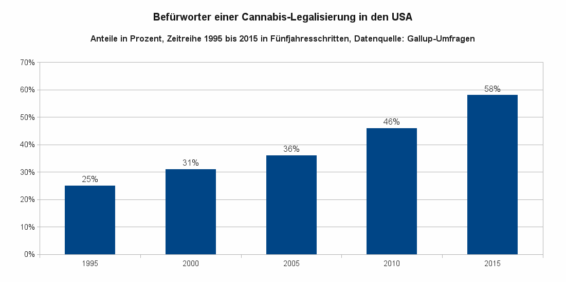 Gemäß Umfragen des Meinungsforschungsinstitut Gallup sprachen sich erstmals im Jahr 2011 die Hälfte der US-Amerikaner für eine Legalisierung von Cannabis aus. 1970 waren es nur 12 Prozent, 1985 schon fast doppelt so viele, nämlich 23 Prozent, zehn Jahre später dann 25 Prozent und gemäß der letzten Umfrage, die vom 7. bis 11. Oktober 2015 durchgeführt wurde, waren es 58 Prozent.