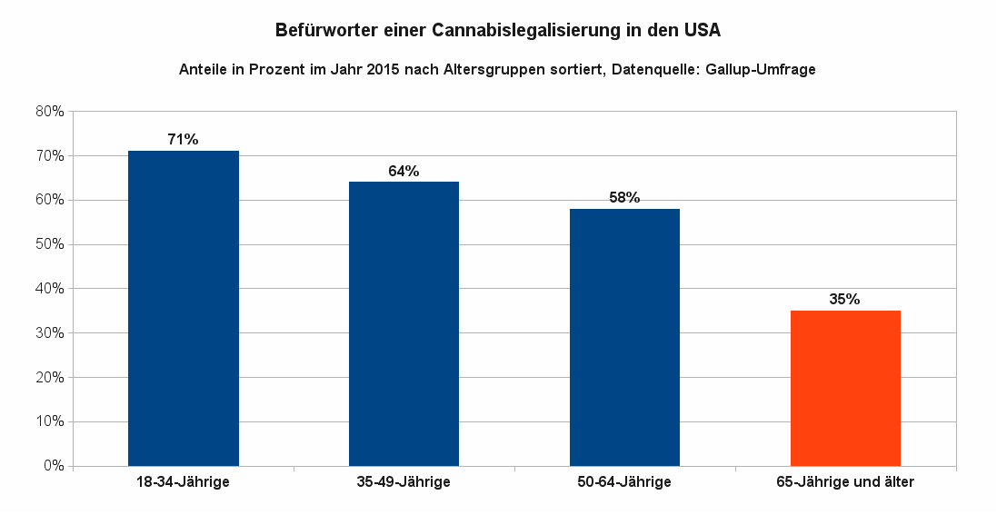 Abbildung 5 zeigt die Zustimmungsraten bezüglich einer Legalisierung von Cannabis in den USA im Jahr 2015 nach Altersgruppen aufgeschlüsselt.Abbildung 5 zeigt die Zustimmungsraten bezüglich einer Legalisierung von Cannabis in den USA im Jahr 2015 nach Altersgruppen aufgeschlüsselt. Bei den 18 bis 34-Jährigen ist die Zustimmungsrate mehr als doppelt so groß wie bei den Rentnern (65-Jährige und ältere Personen).