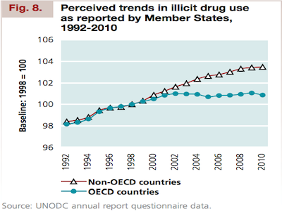 La conclusión obvia que uno puede sacar de este y de una serie de otros informes es la siguiente: la situación jurídica de un medicamento no influye en el resultado de las medidas de reducción de la demanda. Esto es en contraste con la tasa de uso de cigarrillos, una droga regulada, que se redujo significativamente desde el 37% en 1975 a menos del 20% en 2011.