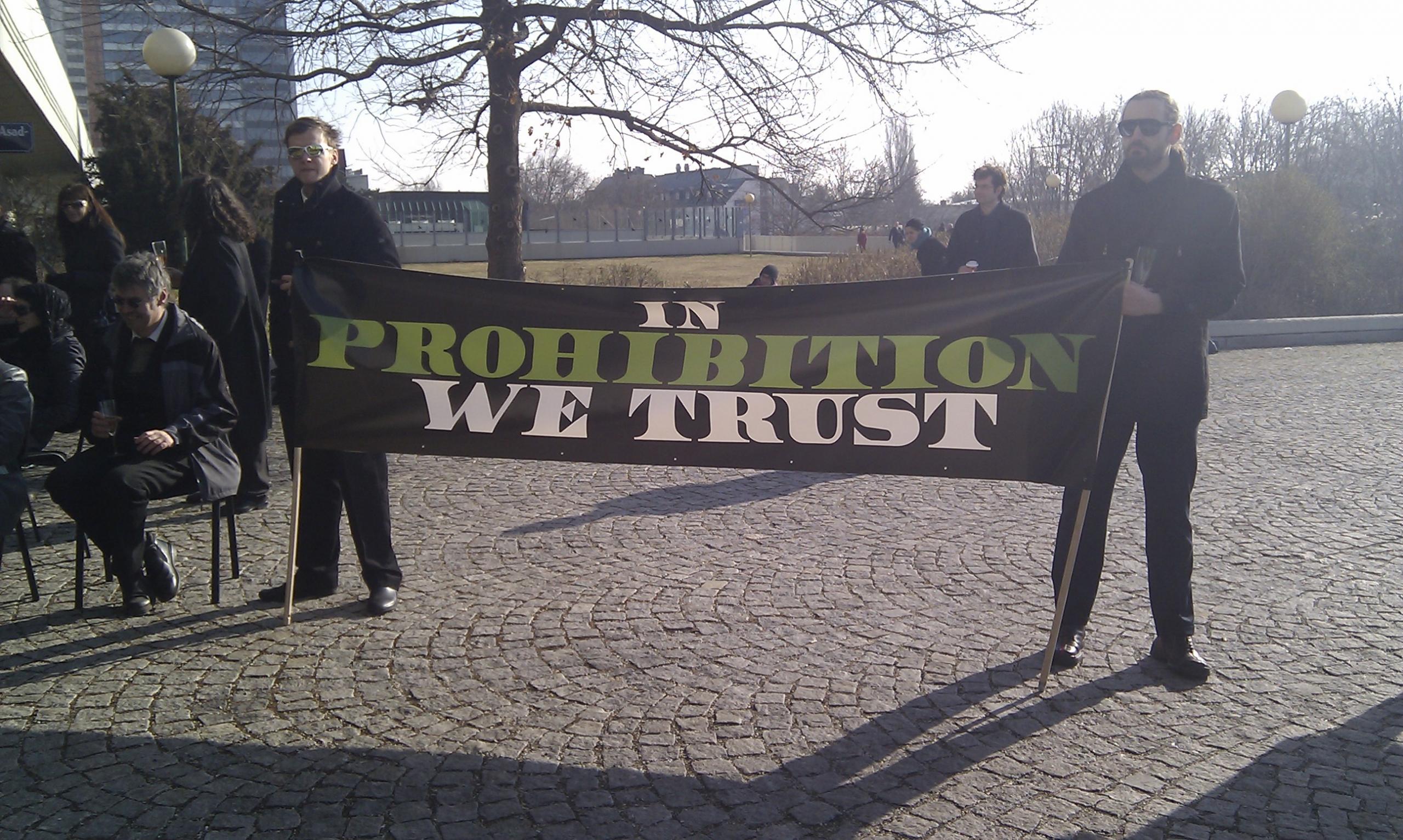 I nostri amici della Hungarian Civil Society Union cercavano di sembrare dei tipi della mafia che distribuivano dei biglietti da 1000 dollari con la faccia del direttore esecutivo, ringraziando UNODC e CND per i cinquant’anni della proibizione delle droghe. Sulle banconote è scritto “In Prohibition We Trust” e “Dite no alla riforma delle leggi sulle droghe”.