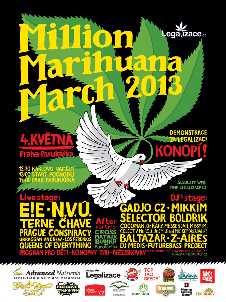 V sobotu 4. května 2013 se v Praze uskuteční již šestnáctý ročník tradiční demonstrace, pochodu a kulturně zdělávacího happeningu za legalizaci konopí, které jsou součástí celosvětové kampaně Million (též Global) Marihuana March. Demonstrace začne ve 12.30 srazem na Karlově náměstí.