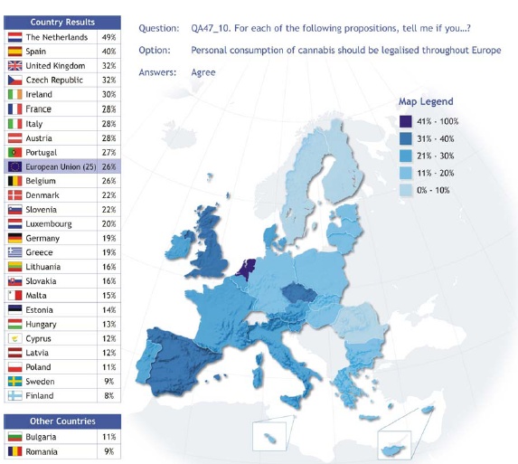 From a survey carried out last year by the EUROBAROMETER it turns out that 26 % of EU citizens is in favour of legalisation of cannabis.