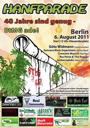 On Saturday the 6th August 2011 the Hanfparade want to demonstrate with you in Berlin for the legalisation of Cannabis as medicine, raw material and natural stimulant. The demonstration starts at 1 p.m. next to “World Time Clock” at (Station) Alexanderplatz with the motto “40 Jahre sind genug – BtMG ade!” (40 years are enough – Bye Bye BtMG!).