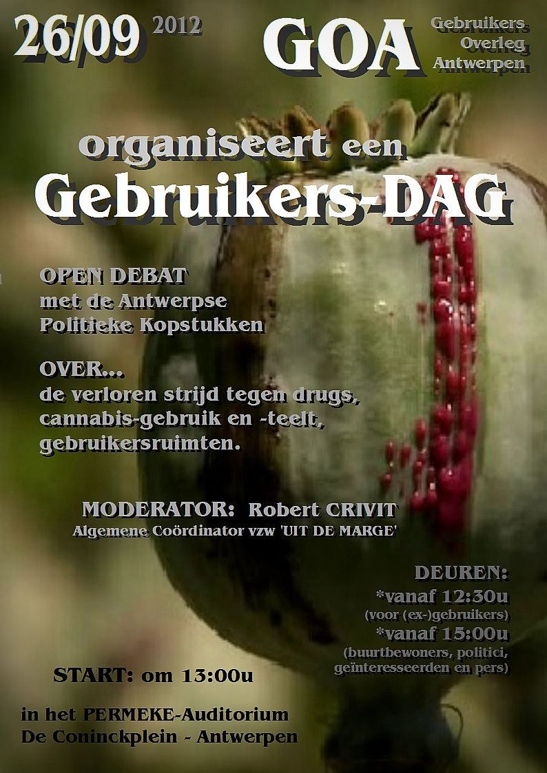 Op woensdag 26 september 2012 organiseert het Gebruikers Overleg Antwerpen (GOA) de Antwerpse Gebruikersdag. GOA is een platform voor verschillende Antwerpse gebruikers en gebruikersorganisaties, die willen meedenken rond en meewerken aan een degelijk Antwerps drugsbeleid, mede ondersteund door enkele vertegenwoordigers uit de drughulpverlening.