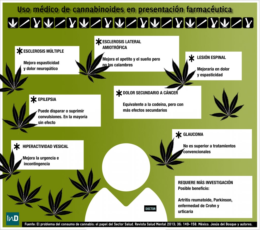 En España solo hay aprobado un medicamento, el Sativex, cuyo principio activo es el cannabidiol. Las indicaciones terapéuticas recogidas en el Vademecum se refieren al uso del mismo como tratamiento para mejorar la situación de la espasticidad (rigidez muscular)en pacientes con esclerosis múltiple. Sin embargo, según explica Calixto Sánchez, jefe del Servicio de Anestesiología y Reanimación del Hospital de Elda, algunos médicos de España han sido autorizados para utilizarlo con otras etiquetas, por ejemplo, para dolores oncológicos fuertes o problemas neurodegenerativos e incluso para reducir las náuseas provocadas por quimioterapia.